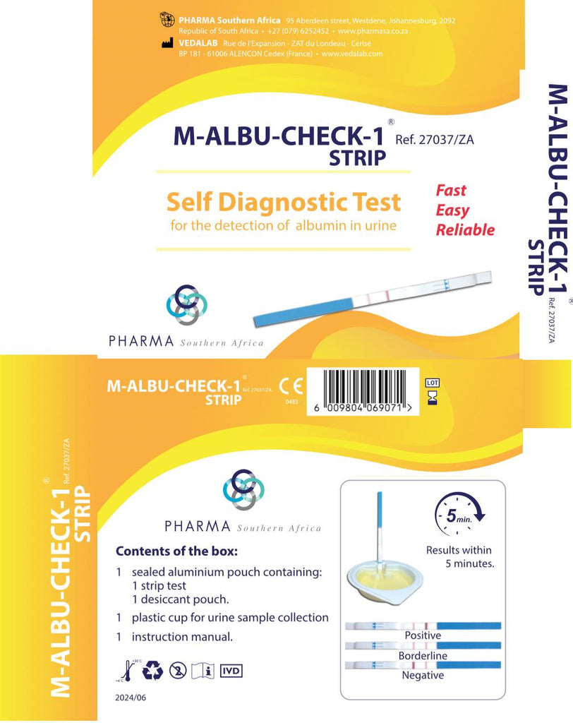 M-ALBU-CHECK-1® is a specific, rapid immunodiagnostic test for qualitative confirmation of the presence of albumin in urine. The test allows to determine the pathological concentration of albumin in urine(above 10mg/L).