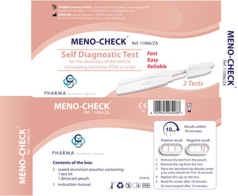 MENO-CHECK® is a specific, rapid immunodiagnostic test that detects the presence of FSH when its urine concentration exceeds 25 mIU/mL. Stream test – 2 tests per package.