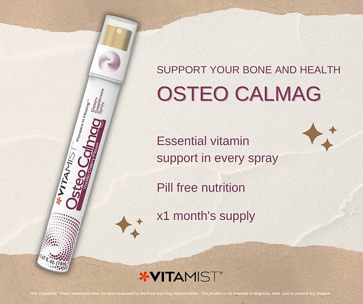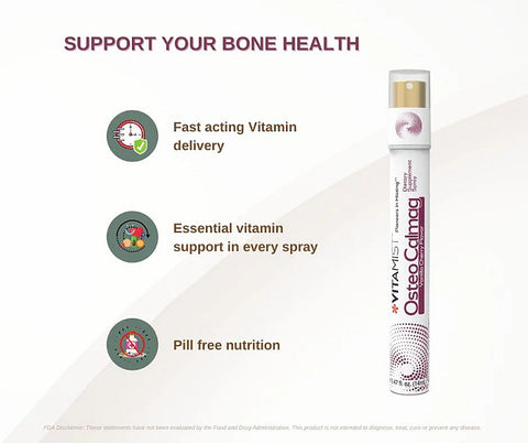 VitaMist Osteo-Mag Oral Spray provides the benefits of time proven nutrients, soluble Magnesium and essential Vitamin D, which help support and maintain strong healthy bones.