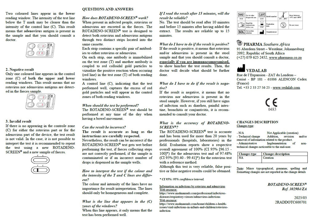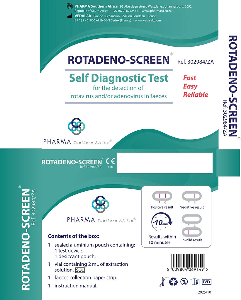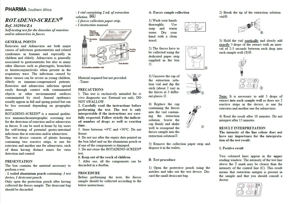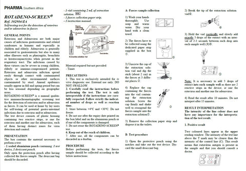 Rotadeno-Screen is a manual qualitative immunochromatographic screening test for the detection of Rotavirus and/or adenovirus in faeces. It can be used at home by lay users for self testing of potential gastro-intestinal infections due to rotavirus and/or adenovirus
