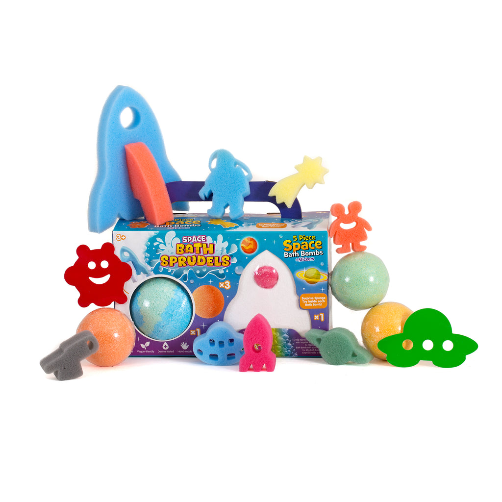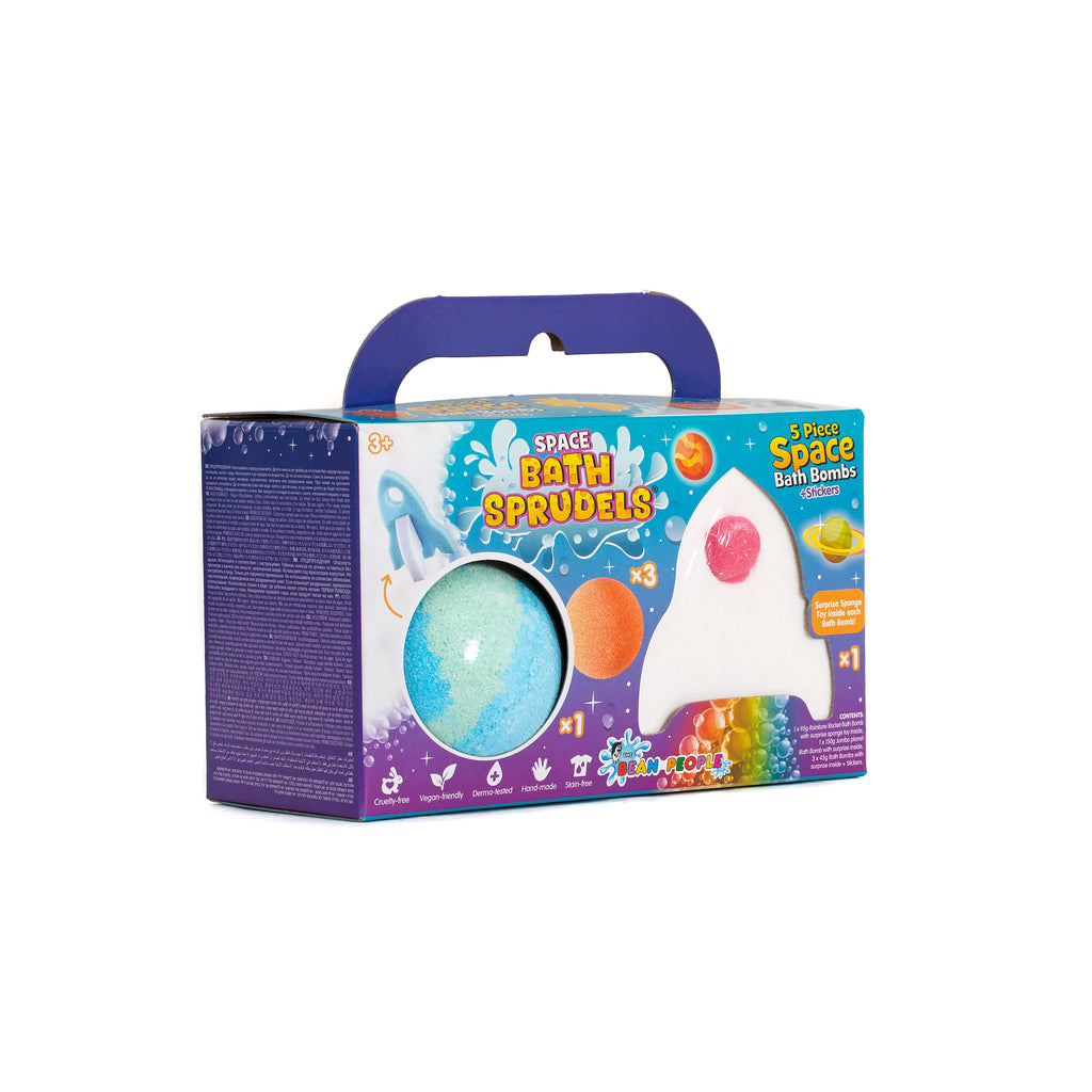 BATH SET CONTENTS: 1 x Earth Jumbo Bath Bomb with 3D puzzle sponge toy inside. 1 x Rainbow making Rocket Bath Bomb. 3 x Planet Bath Bombs with 2 surprise space characters in each one! As an added bonus, Space Stickers are included to add an extra dimension of play value, beyond the bath tub.